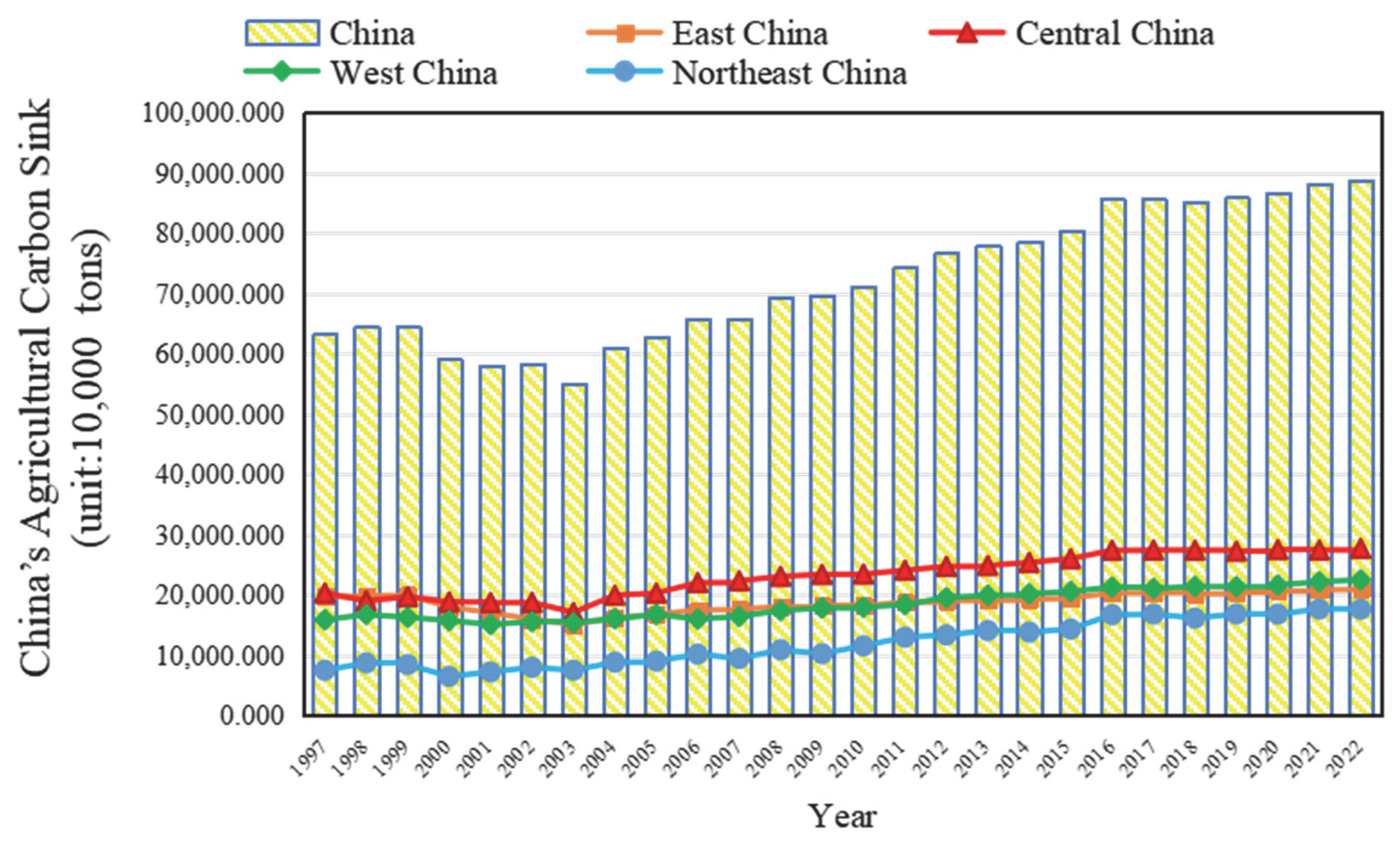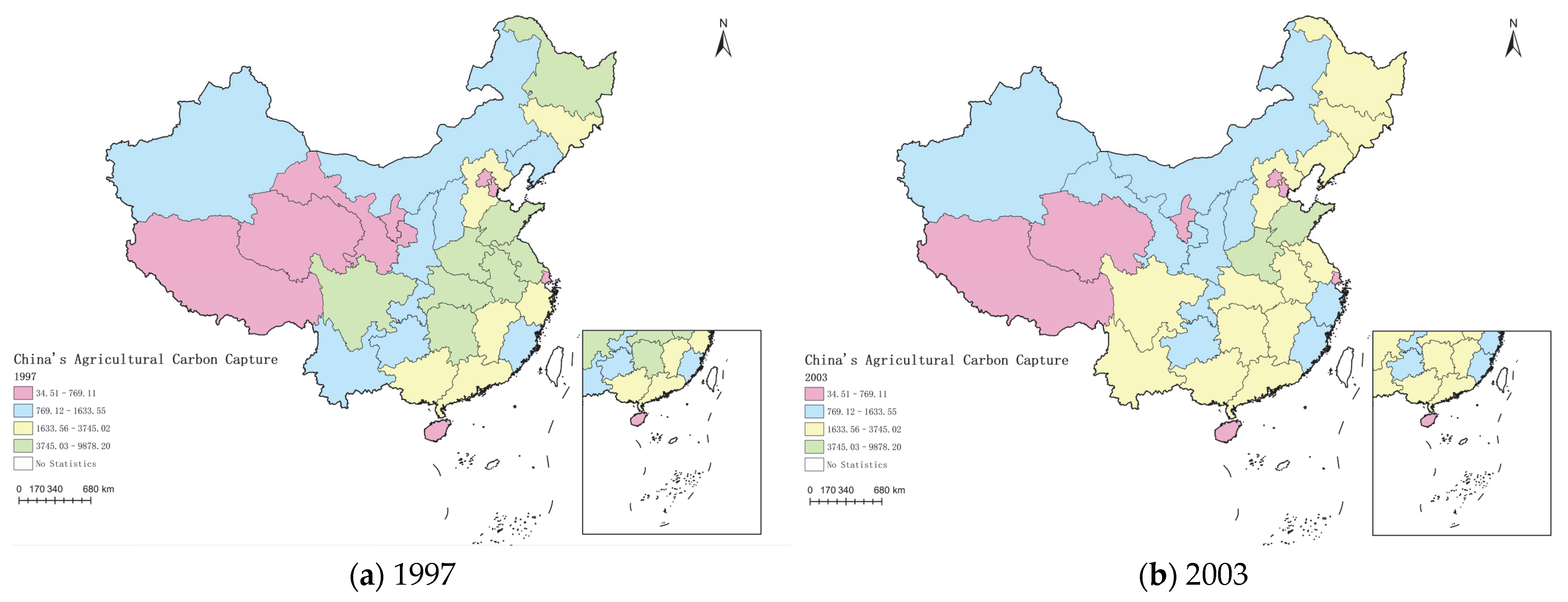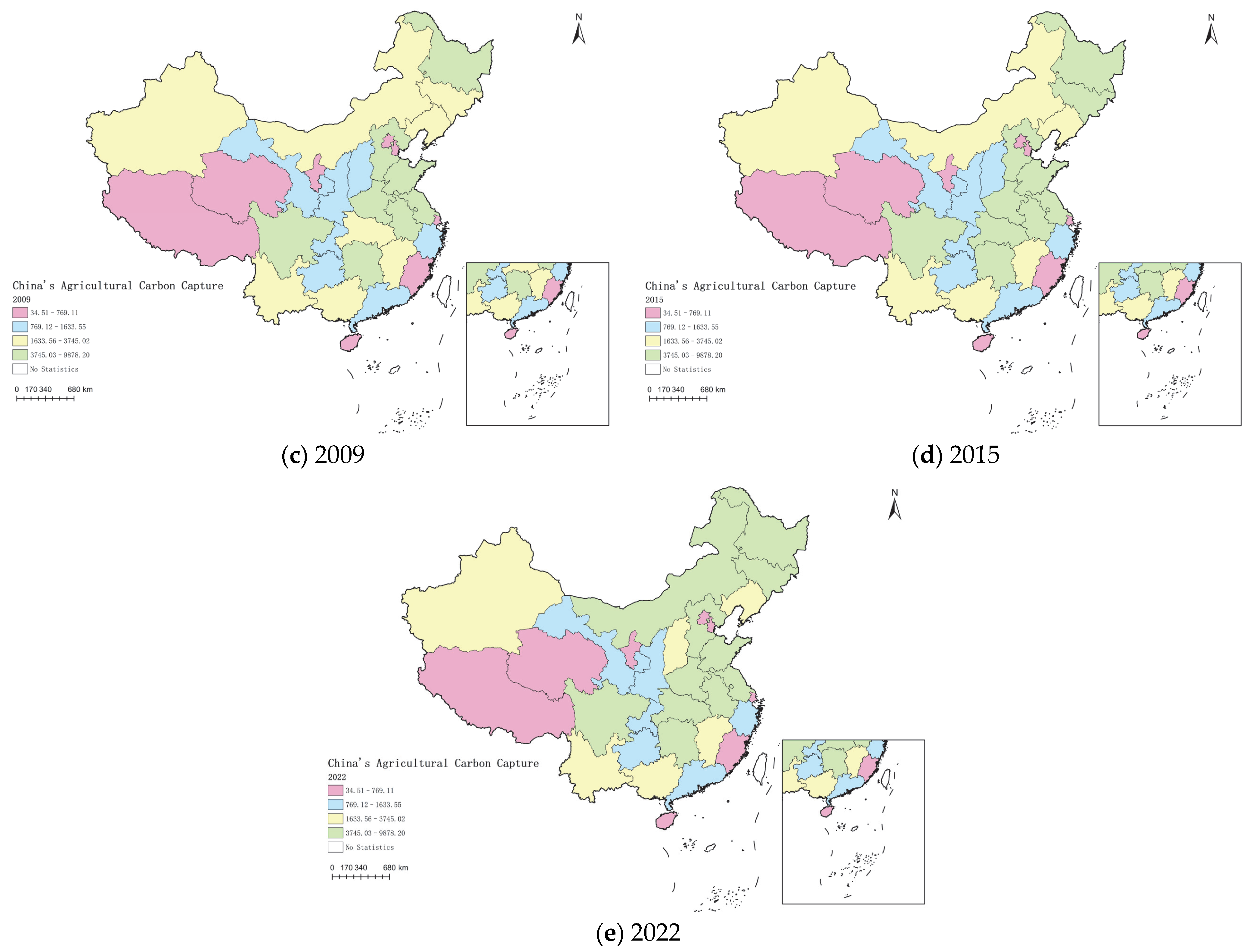3.1. Spatial–Temporal Patterns and Evolutionary Dynamics of Carbon Capture in China’s Agricultural Land Use