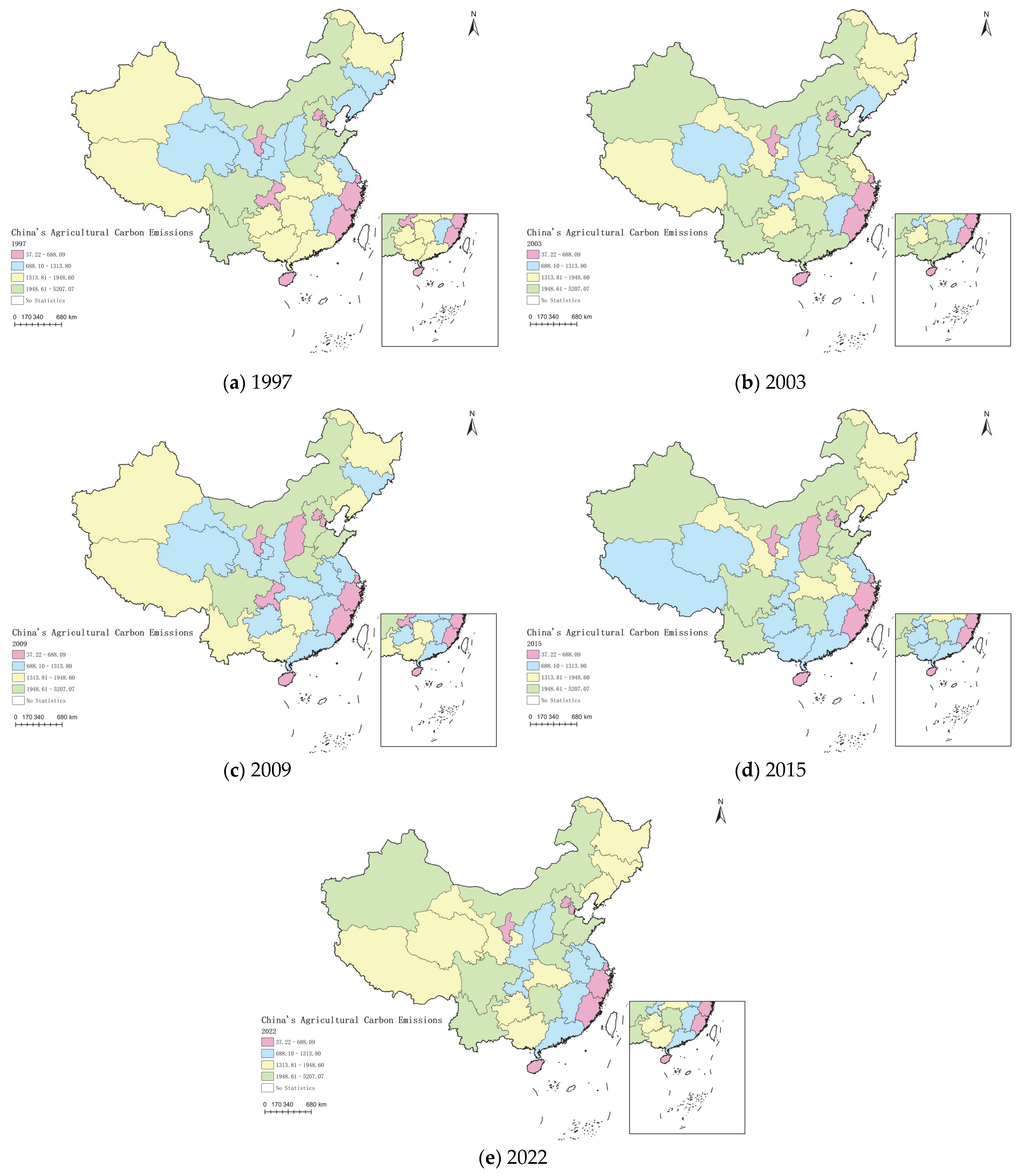 3.2. Spatial–Temporal Patterns and Evolutionary Dynamics of Carbon Emissions in China’s Agricultural Land Use