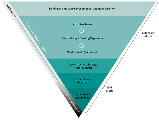 Circular economy and circular city initiatives reimagine regional economies as transitioning from linear and extractive to circular, in which products and materials are (re)circulated “at their highest utility and value” [68]. Shifting from demolition to reinvestment in existing building stock or deconstruction where redevelopment is necessary represents important steps toward circularity in the built environment.