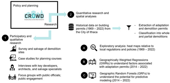 This paper should be understood as embedded in a larger research project (Figure 2) consisting of both qualitative (Part 1) and quantitative (Part 2) elements. The larger project is action research involving the Circularity, Reuse, and Zero Waste Development (CR0WD) network, which involves academic labs working with community leaders in planning, preservation, and building material reuse. This paper does not represent the full scope of that research but focuses primarily on the spatial analysis of building permits, i.e., Part 2. These spatial analyses consisted of several steps, which we will recount in order in this methodology. For this analysis, a dataset of building permits was acquired from the city. Permits of interest, i.e., demolition and adaptation permits, were extracted and cleaned.