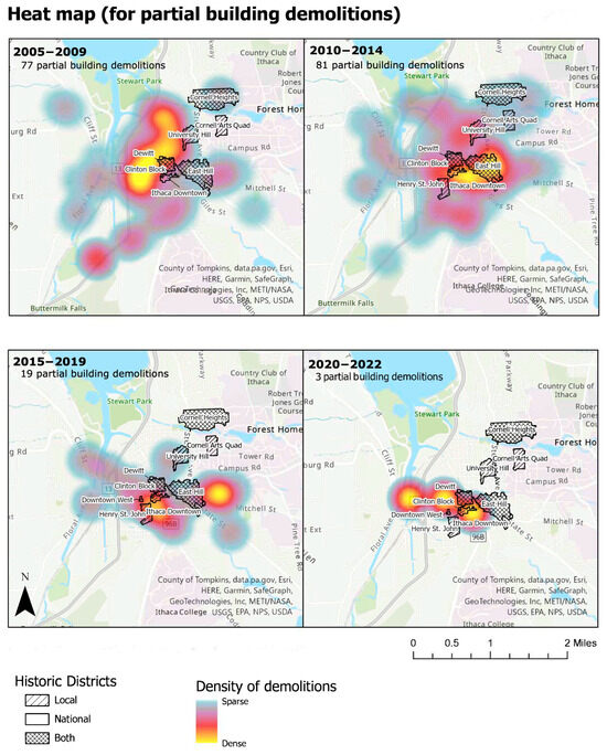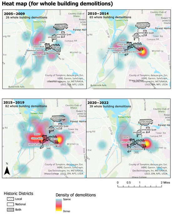 Figure 3 and Figure 4 provide heat maps showing the density of partial- and whole-building demolitions over time. Where the decade between 2005 and 2015 saw a larger number of partial demolitions across the city, the period post-2015 has seen a shift towards whole-building demolitions, increasingly concentrated in the central city and areas surrounding Cornell University. These are aligned with the period of more rapid redevelopment the city has been witnessing. Importantly, a comparison of demolition activity with reference to the location of historic districts reveals a clear difference—where whole-building demolitions are expressly situated outside historic districts, these districts have been the sites of many partial demolitions, even coinciding with hotspots of activity. According to our sources in the historic preservation community, historic districts were established as a policy response to redevelopment pressures in areas where residents were attached to older urban fabric, either for its architectural character, sense of place, or historic associations. This is also consistent with observations made by other scholars [56]. Such regulations could thus enable the conservation of embodied carbon through reinvestment in building stock as opposed to redevelopment.