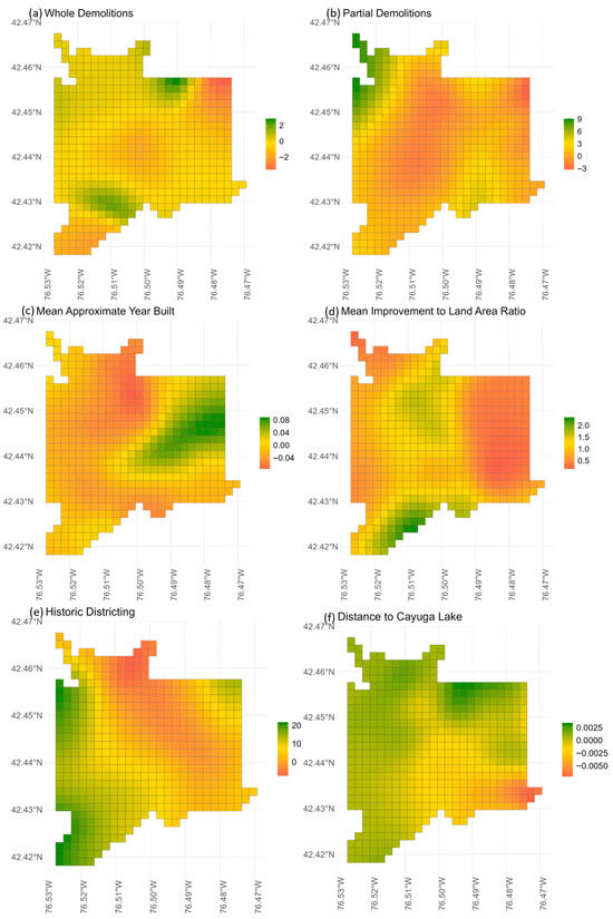 Maps of the GWR coefficients of different variables: (a) whole-building demolition permits; (b) partial-building demolition permits; (c) mean approximate year built; (d) mean improvement-to-land-area ratio; (e) historic districting; and (f) distance to Cayuga Lake.