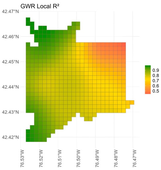 The GWR was estimated for the same specification as the OLS using a Gaussian neighborhood with a bandwidth of 1800 feet, which minimized the AIC. This spatial kernel corresponds to approximately 4 to 6 city blocks and, from our subjective experience of Ithaca, is a reasonable distance over which neighborhood character extends. ChatGPT (Version o3-mini) was used to help troubleshoot some initial errors in the code. Researchers then produced maps demonstrating the influence of different variables and local R2 values indicating model fit, which are presented later in this article.
