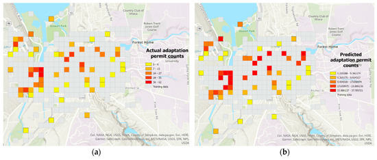 Comparison between (a) actual counts of adaptation permits and (b) predicted adaptation permit activity by the GRF model.