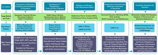 This study adopts an empirical research design, aiming to systematically explore the key factors affecting personnel escape efficiency in high-rise building fires through quantitative methods. The research process is shown in Figure 1. Based on the previous literature review and expert consultation, this study initially proposes an analytical framework covering four core theoretical domains to explore the key factors affecting personnel escape efficiency in high-rise building fires. These four preliminary theoretical domains include: fire emergency management system (FEMS), building-safety performance planning (BSPP), situational panic psychological perception (SPPP), and escape response behavior (ERB).