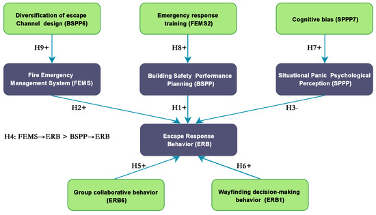 Among them: FEMS is based on risk management theory, emphasizing the role of emergency systems, training mechanisms, and resource coordination in risk response and escape efficiency improvement; BSPP is rooted in the environment–behavior relationship theory, highlighting the key influence of building spatial layout and safety performance in shaping personnel evacuation paths and crowd flow; SPPP draws on stress-cognition theory, revealing the psychological response mechanisms of individuals in fire situations due to panic, anxiety, and cognitive biases; ERB serves as the dependent variable, comprehensively reflecting the combined results of psychological, environmental, and management factors on actual escape behavior.