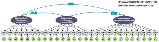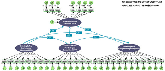 Although exploratory and confirmatory factor analyses effectively revealed the measurement structure and reliability and validity of the constructs related to fire-escape behavior in high-rise buildings, they mainly stayed at the measurement level of “observed variables → latent variables” and could not deeply examine the causal relationships and effect paths among latent variables. Therefore, this study further adopted structural equation modeling (SEM) to make the transition from the “measurement model” to the “structural model” [85].