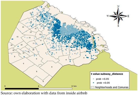 Figure 2 showed that, in the central areas of the city, particularly in the neighborhoods of Recoleta, San Nicolás and Monserrat, proximity to subway stations has a more pronounced and negative impact on price. That is, listings located within walking distance of public transportation had significantly higher prices, confirming tourists’ valuation of accessibility. As accommodations are further away from the urban core, this effect tends to be diluted, reflecting a spatial elasticity in the valuation of this attribute. The t-values indicate that this relationship is statistically significant in most neighborhoods in the center and north of the city.