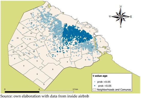 Figure 3, the age of the listing on the platform also showed a positive relationship with price, especially in central and high tourist density areas. In neighborhoods such as Palermo, Retiro and Recoleta, older listings tend to set higher prices. This situation could be attributed to the experience accumulated by the hosts, their consolidated reputation and a greater optimization of commercial strategies. This variable acts as a proxy for host maturity on the platform, and its positive effect on price is spatially heterogeneous, but statistically robust in the northern corridor of the city.