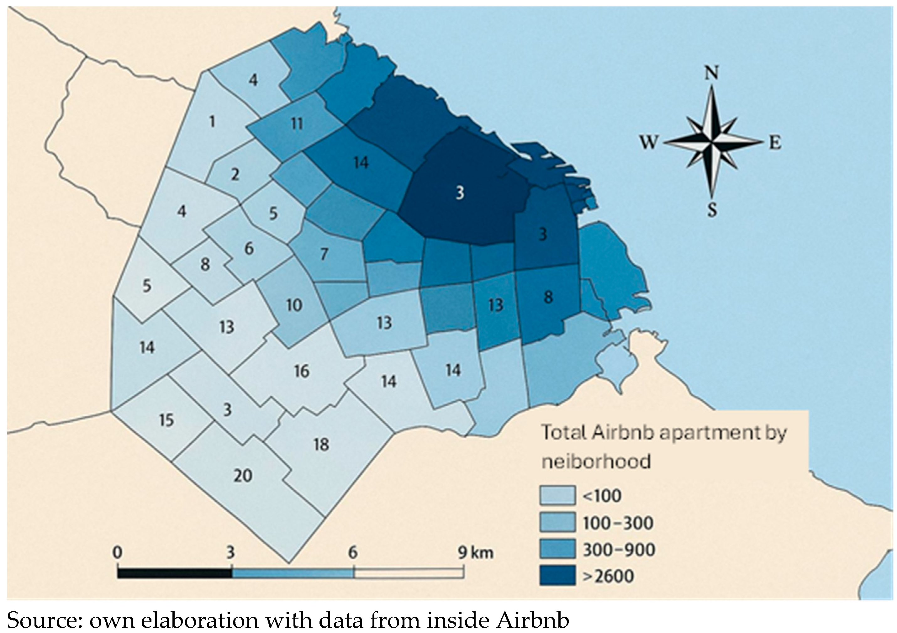 In the case of Argentina, and particularly in the Autonomous City of Buenos Aires (CABA), evidence remains limited. Available studies have focused on traditional variables—such as number of rooms, type of accommodation, urban location, user ratings, and certain socioeconomic indicators—but they tend to rely on global models that assume spatial homogeneity, which limits their ability to capture the territorial diversity characteristic of such a heterogeneous city [41,42].