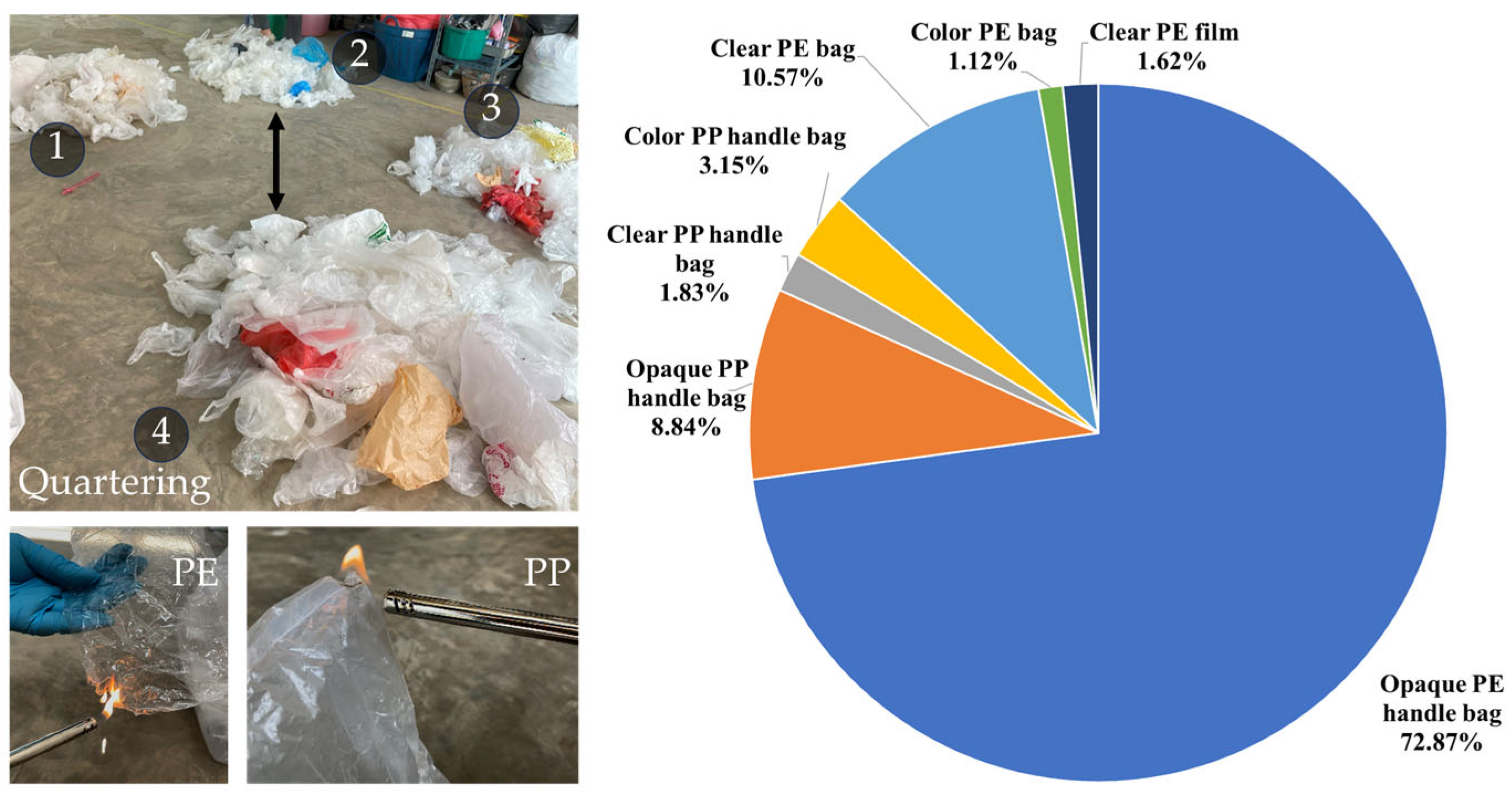 Figure 5. On average, the dominant waste fraction was opaque PE handle bags (72.87%), which are widely used in grocery stores, markets, and restaurants. Categorization by bag type shows that handle bags accounted for 86.69% of the total plastic waste, followed by non-handle bags (11.69%) and plastic films (1.62%). In terms of polymer composition, PE represented 86.18% of the total, while PP accounted for 13.82%. Similar findings have been reported in previous studies, where PE was also found to be the predominant plastic type compared to PP [
