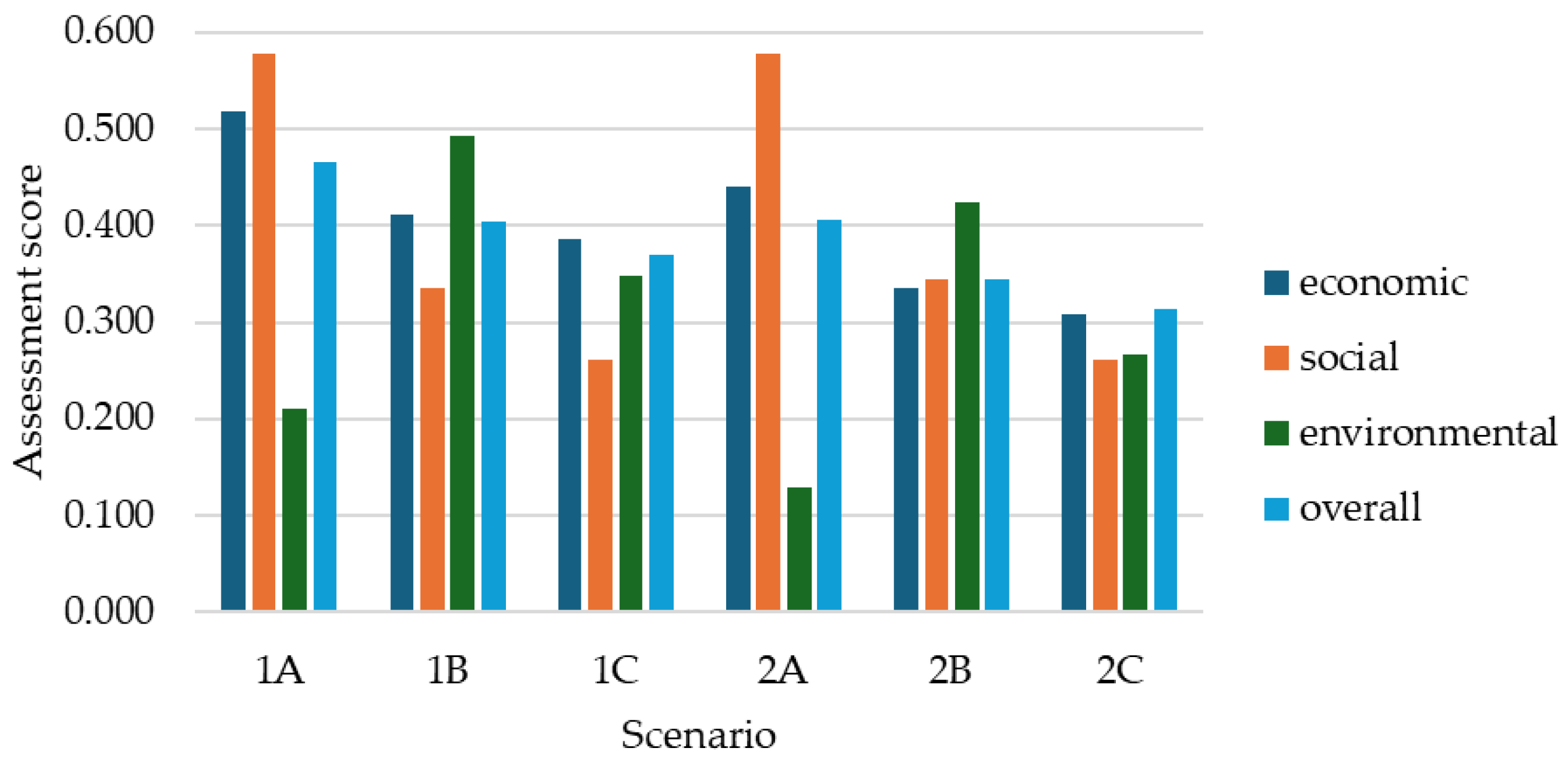 The analysis of the economic assessment values revealed that scenario 1A achieved the highest economic score (0.518), followed by 2A (0.440), as illustrated in