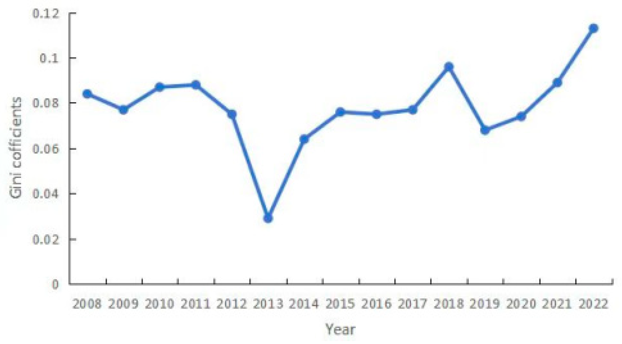 As shown in Figure 5, at the regional level, the disparity between Jilin Province and Heilongjiang Province was consistently larger than that between Liaoning Province and the other two provinces. However, during 2019–2022, the gap between Liaoning and Jilin exceeded that between Jilin and Heilongjiang, making Liaoning and Jilin the two provinces exhibiting the greatest inter-regional differences. In contrast, the disparity between Liaoning and Heilongjiang remained the smallest overall. Although the inter-regional Gini coefficient between Liaoning and Heilongjiang surpassed that between Jilin and Heilongjiang in 2022, it remained lower than the gap between Liaoning and Jilin.