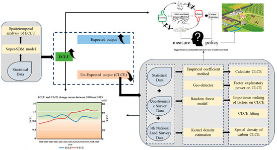 In this study, the Super-SBM model was utilized to quantify the ECLU considering unexpected output (CLCE) in Aksu. Then the empirical coefficient method was adopted to calculate the CLCE. Meanwhile, we estimated the CLCE by kernel density analysis, which showed spatial differences based on data from the Third National Land Survey and questionnaire surveys. Subsequently, the importance ranking of CLCE of collective cultivated land, state-owned cultivated land, food crops, and non-food crops was analyzed by using the RFR model. Finally, Geo-detector models were used to investigate the driving factors of CLCE and reveal spatial differentiation.