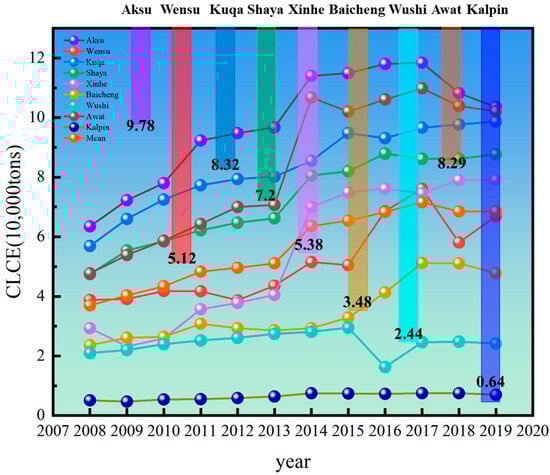 CLCE by counties and cities in Aksu, 2008–2019 (unit: 10,000 tons).