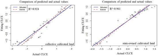 As illustrated in Figure 5, the RFR model was utilized to determine the IncMSE ranking of factors influencing CLCE in the study area based on data from the 209 surveys. It should be noted that variable importance derived from the random forest model reflects each factor’s contribution to predictive accuracy rather than direct causal influence. The results consistently indicate that AF is the most important predictor of CLCE for both collective cultivated land and state-owned cultivated land. The CF ranks second in importance for both cultivated land types, following AF (Figure 5a,b). Additionally, we assessed the relative importance of factors affecting CLCE in food crops versus non-food crops (Figure 5c,d). Notably, after AF, AE shows a stronger association with CLCE in agricultural production for non-food crops than for food crops. Overall, the factors examined contribute more substantially to predicting CLCE in state-owned cultivated land than in collective cultivated land and show greater importance for non-food crops compared to food crops. The remaining four factors (P, AD, I, and AE) exhibit varying levels of association with CLCE.