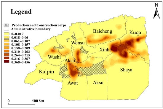 Kernel density estimation map of CLCE in Aksu. Note: Based on the ownership of cultivated land in the Third National Land Survey, the empirical coefficient of cultivated land carbon emissions and 209 carbon emission items in the agricultural production process of farmers, the kernel density map of CLCE in Aksu was visualized by using the kernel density estimate method.