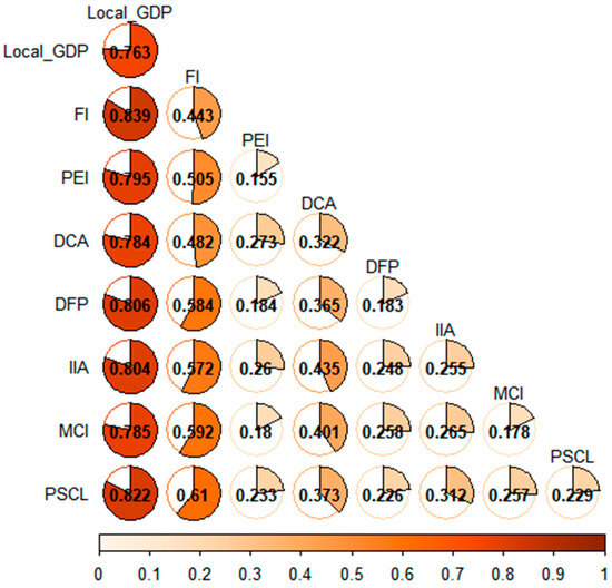 Based on the identification of the driving factors of CLCE, further exploration was conducted to examine the interaction of each driving factor (Figure 8). The interaction type of each driving factor is a nonlinear enhancement, indicating that the double factor interaction positively strengthens the driving force of each single factor on CLCE in Aksu. The interaction between Local_GDP and FI (0.839) had a stronger effect on the CLCE in Aksu than that of a single factor (0.763 and 0.443). The interaction between these two factors has the strongest influence on CLCE in Aksu compared to any other pair of factors. Additionally, it was found that the interactions between Local_GDP and DFP, Local_GDP and IIA, and Local_GDP and PSCL exhibited stronger explanatory power for CLCE than did any single factor, with an interaction force reaching more than 0.8.