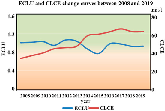 Curve of ECLU and CLCE in Aksu between 2008 to 2019. Note: ECLU (left Y-axis): Eco-Efficiency of Cultivated Land Utilization calculated based on the super-efficiency SBM model (dimensionless); CLCE (right Y-axis): total carbon emissions from cultivated land in the current year (unit/t).