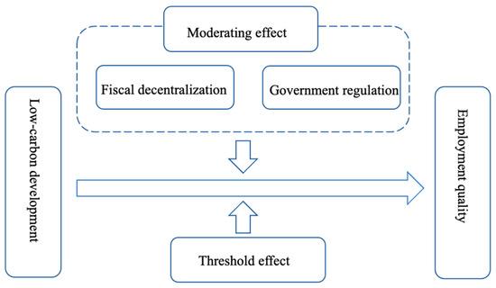 Under the background of globalization, from the government’s perspective, the mechanism of the impact of low-carbon development on the employment quality of Chinese cities presents diverse characteristics. Some studies point out that low-carbon related policies such as carbon tax policies [1], environmental regulations [2,3,4], emission trading policies [5,6] and low-carbon city pilot policies [7,8] can create employment opportunities, optimize the employment skill structure and promote the skill upgrading of the employment market through means such as incentivizing green investment of enterprises, optimizing production processes, improving environmental protection standards and expanding the scale of enterprises. In terms of specific industries and groups, green and low-carbon development provides high-quality employment opportunities for vulnerable groups such as migrant workers, and models such as green manufacturing support the expansion of the labor employment scale of enterprises [9,10]. However, some studies also show that strict environmental regulations may increase the costs of enterprises, reduce production scale, and lead to the reduction in employment positions in specific industries such as high-pollution industries [11,12]. Environmental regulations may also trigger industry transfer, reduce employment quality, sacrifice the employment of groups with low education levels, and the emission trading system has an inhibitory effect on the labor employment of enterprises [13,14,15,16,17,18]. In addition, other studies have found that there are nonlinear relationships such as U-shaped and inverted U-shaped between environmental regulations and the total employment volume, employment structure, employment scale, and high-quality employment, and different nonlinear characteristics also appear in different industries and cities [19,20,21,22,23]. Some studies also hold that the overall impact of some low-carbon development policies such as carbon taxes [24] and support for environmental protection industry policies [25] on the employment market is relatively limited, and there is no significant large-scale impact [26].