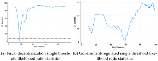 According to the principles of the threshold model, the estimated threshold value corresponds to the point at which the likelihood ratio statistic (LR) approaches zero. Figure 2a presents the likelihood ratio function for the fiscal decentralization single threshold under the 95% confidence interval, while Figure 2b shows the corresponding function for government regulation. The minimum point of the LR statistic indicates the actual threshold value, and the dashed line represents the critical value of 7.35. Since the critical value of 7.35 is significantly greater than the threshold value, it can be concluded that the estimated threshold values are real and valid.