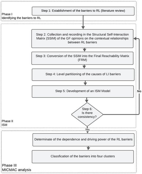 Aiming to understand the relations among the barriers hindering the implementation of RL, Interpretive Structural Modelling (ISM) can be a supporting tool to consider. It can identify and summarise relations between specific variables defining a problem or issue [8]. ISM and Matrix Cross-Impact Matrix Multiplication (MICMAC 3) have been adopted in similar studies on adopting innovative technologies and practices. The literature review shows that ISM has been carefully used by researchers in various areas such as construction [9], RL suppliers [10], the health system [11], the supply chain [12], entrepreneurship [13], education [14], e-commerce [15], the lean system [16], six sigma [17], and agriculture [18].