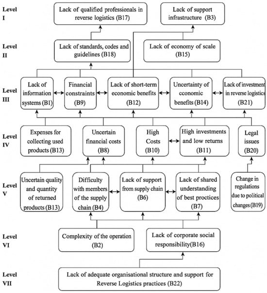After completing the reachability matrix, the barriers are divided into levels. To establish the relevance of each barrier, they are divided into various levels, and three sets are created to divide the barriers efficiently. These are the sets of intersection, reachability and antecedents. The set of reachability includes the barrier in question and all the barriers that depend on it. The antecedent set includes the barrier and all those that affect or influence it. Finally, the intersection set combines the sets of reachability and antecedents, representing the barriers that depend on and affect the original variable. In the ISM hierarchy, the barriers with the same reachability and intersection are designated as Level I or higher-level barriers. The process of determining the remaining levels is iterative, with the variables of the previous level being eliminated until all have been attributed to a level. Level I barriers are at the top of the ISM hierarchy and do not influence the other barriers. In the higher levels, the barriers are in the lower part of the ISM hierarchy and have a greater influence on the other variables [44,61].