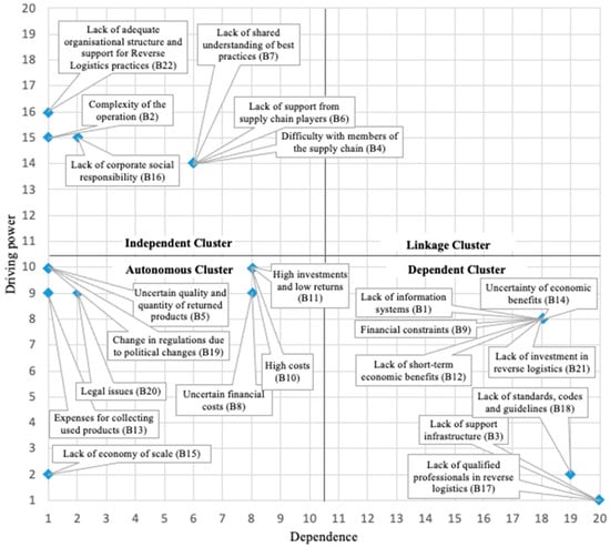 For a more thorough analysis of the main barriers to implementing RL, as defined in phase III of the methodology, we perform a MICMAC analysis, exploring these barriers’ power of influence and dependence.