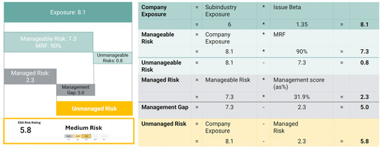The ESG risk rating developed by Morningstar Group’s Sustainalytics [74] was used as an explanatory variable (“Rating”). This rating represents the overall level of ESG risk to which a company is exposed, as well as the adequacy of the company’s management of these risks. As explained below, this measure captures both the unmanageable risk, which cannot be easily mitigated but needs to be understood and quantified, and the manageable risk that the company is able to manage effectively. To this end, the methodology estimates based on the company’s business model the overall ESG risk level that company is exposed to but also identifies the manageable part of such risk. In parallel, based on the review of company’s ESG and risk management practices, it estimates the level of ESG risks that are effectively managed by this company. This allows the creation of a consolidated rating, which measures (i) the scale of ESG risks, understood as the balance ESG threats and opportunities that characterize the company’s operations (company’s exposure in Figure 2), (ii) the quality of the company’s ESG management approach (understood as the efficiency with which the company handles manageable part of such exposure—managed risks in Figure 2) and (iii) the gap in the ESG risk management (a sum of unmanageable risks the company is exposed to and the residual amount of manageable risk that the company fails to effectively control—unmanaged risks in Figure 2).