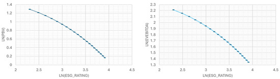 Such non-linearity suggests that companies that either have a significantly higher exposure to climate risk or lag significantly behind their peers in terms of ESG standards may face a higher valuation penalty. At the same time, the ESG premium tends to be relatively moderate as long as the differences in ESG ratings are relatively small and the risk is not considered excessive. The shape of this relationship for the variable LN_ESG_Rating to the power of three is shown in Figure 3. These results are similar to the non-linearity conclusions confirmed by Dayal et al. [77] and Alfalih [78] for other markets. One possible explanation is the popularity of red-flagging as one of the main tools for incorporating ESG information into investment decisions (as shown, for example, by Van Duuren et al. [79]) or the more pronounced role of ESG factors in the case of companies that tend to be over or undervalued (as per Khan et al. [33]).