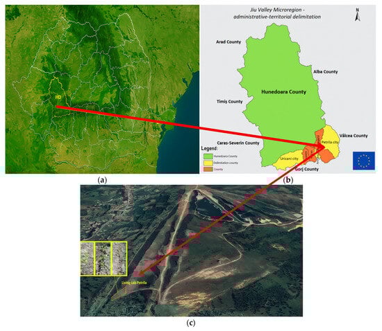 Living Lab from Petrila Branch IV, Jiu Valley, Romania: (a) Physical map of Romania; (b) location of Hunedoara County and delimitation of the Jiu Valley micro-region; (c) location of the Living Lab on the Petrila tailings dump.