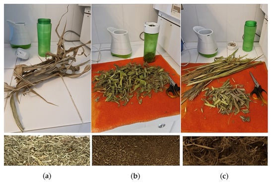 Biomass before and after grinding and shredding: (a) Maize; (b) Soybean; (c) Sorghum.