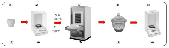 Equipment used for determining W, TS, VS and A for the investigated organic substance: (1). (5) Sample (crucible); (2). (6) Analytical balance (mo); (3). (7) Calcining oven; (4). (8) Desiccators; (5). (9) Analytical balance (mo).