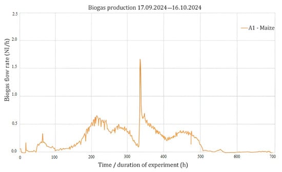 The daily organic loading rate (OLR) is 4.58 g/L/day (with VS1 maize). The daily discharge batch of the evacuated digestate mass is 90.00 g. The experimental values recorded in the cloud (bio process control) were graphically represented to highlight the evolution over time of biogas production [,,]. For maize, we only collected data from the A1 bioreactor during the anaerobic digestion process []. The data from the second maize bioreactor were excluded due to process failure, which occurred because dried maize biomass with elevated lignin content was used. The high lignin fraction hindered microbial accessibility to cellulose and hemicellulose, resulting in poor substrate degradation and process instability. Similar challenges with lignocellulosic substrates have been reported in anaerobic digestion studies [,,].