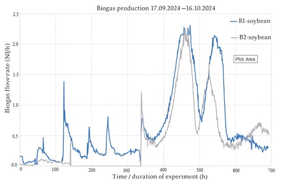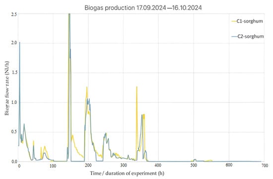 The operating parameters of the digester are as follows: the useful volume of the bioreactor is 1.80 litres, the digestate’s mass is 1800 g, and the dry matter content is set at 10% (by mass) [,]. The calculation of the digester loading batch was carried out as follows: the hydraulic retention time (HRT) is 20–30 days, the loading batch is 90 g/day, the dry substance on the loading batch was calculated at 9 g, and the water content/loading batch is 81.0 g []. The biogas production from the bioreactor that had the B1 and B2 sorghum samples, which was recorded online (bioprocess control), is shown in Figure 6.