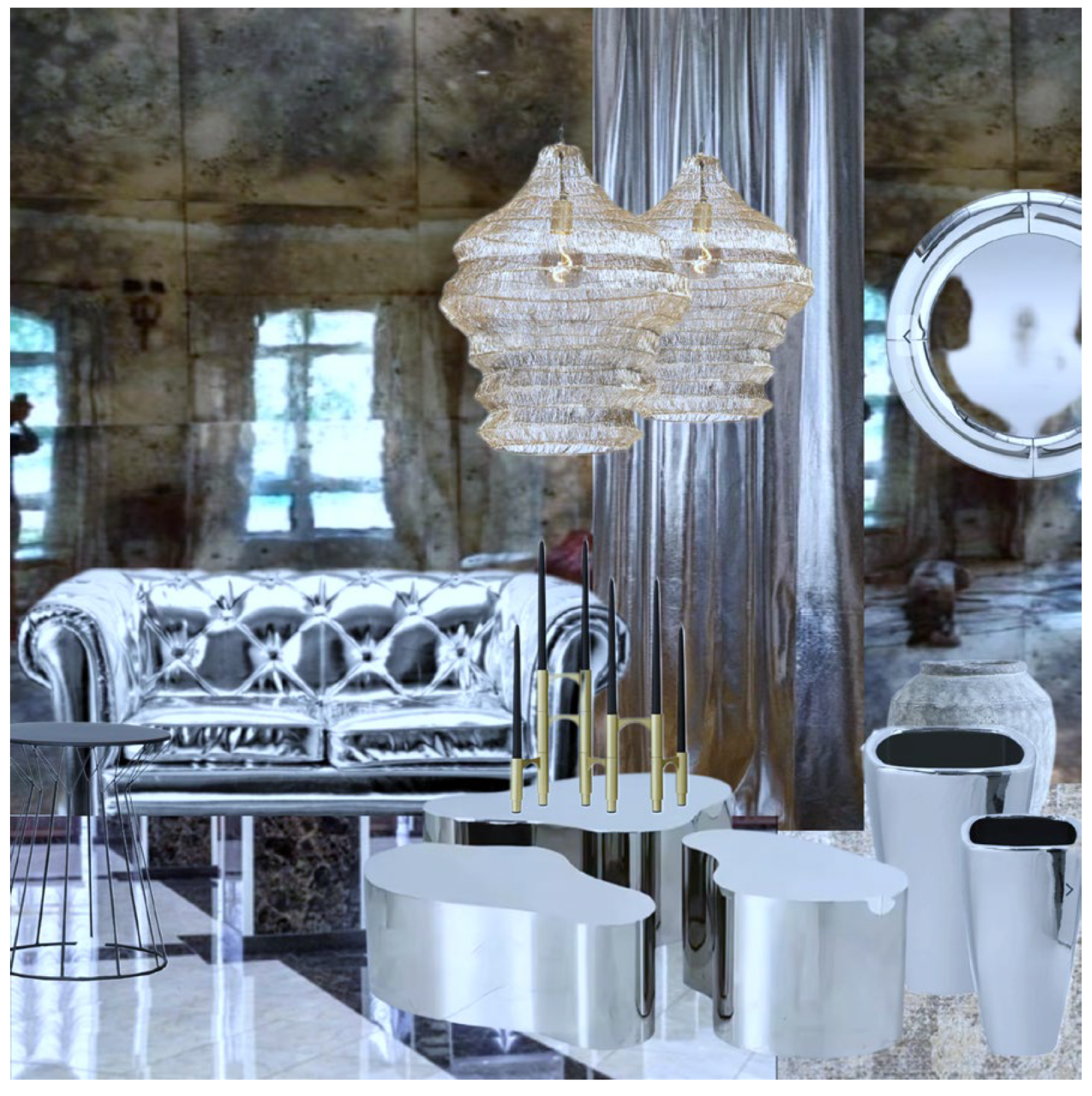 | 3. Materials and Textures | Smooth surfaces (lacquered finishes, glass, polished stone, metal). Light, airy materials—semi-transparent textiles (voile, organza, mesh fabrics). Reflectivity—glass and polished surfaces reinforcing the sense of coolness. | Rough, rough surfaces (concrete, raw wood, brick, unpolished stone). No gloss, light absorbing materials. Variety of textures creating anxiety and tactile contrasts, textures soft, warm to the touch |