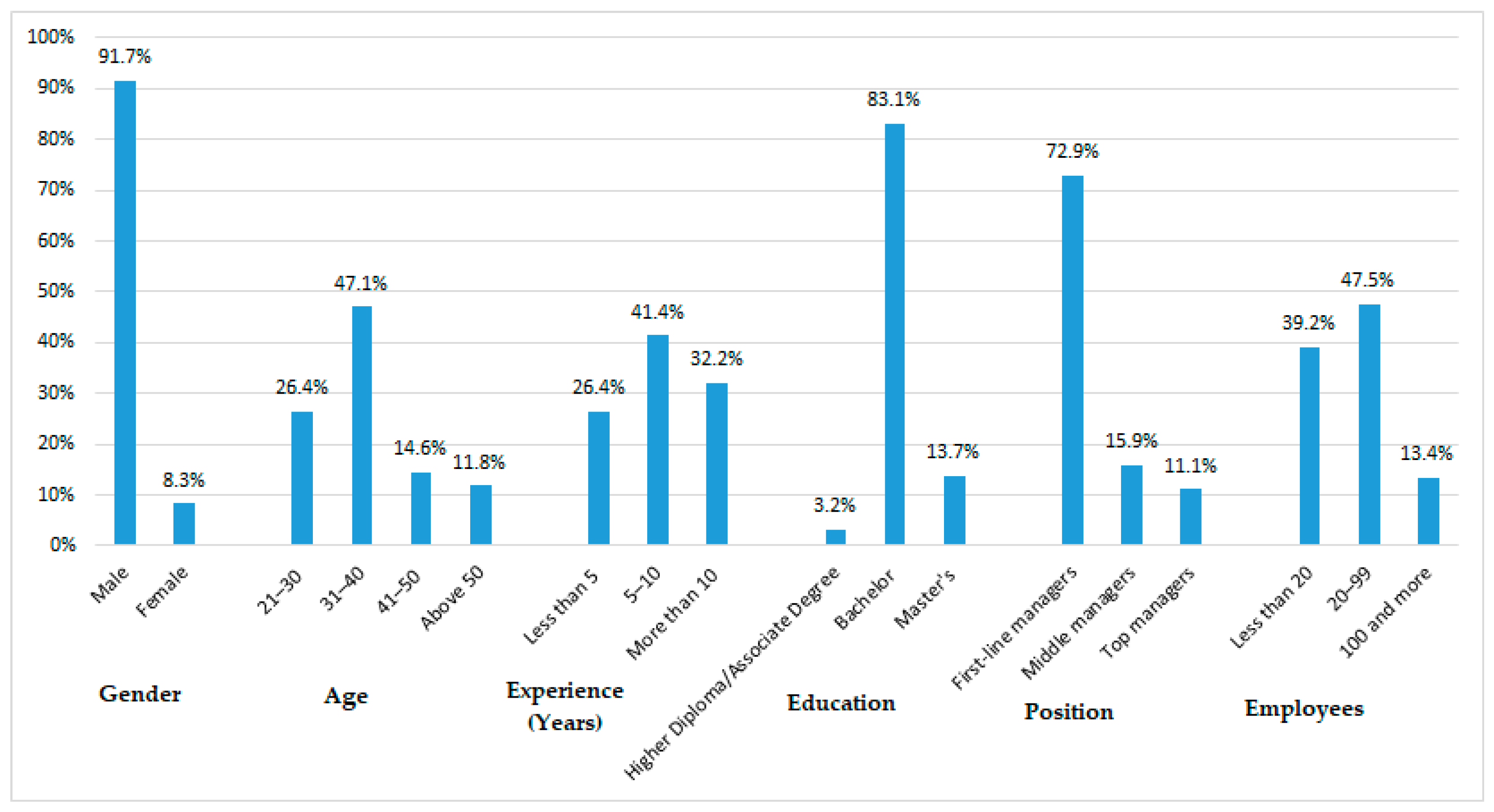 The sampling procedures in this study involved defining the sampling frame, selecting appropriate sampling methods, determining the sample size, and implementing data collection procedures. The target population comprised employees from diverse organizations situated in Amman, Jordan. To get a range of points of view and get insights from decision-makers at different levels of the organization, respondents came from different management levels, such as operational, middle, and top management.