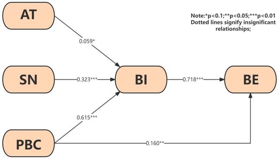 - The intention-to-be has a high degree of significance to the result of the behavior, and the path coefficient is large (β = 0.718); residents’ intention and behavior are highly positively correlated. There is a notable connection between behavioral intention and real behavior. When residents have a strong will to participate in the recycling of old clothes, they are more likely to translate this will into actual action.