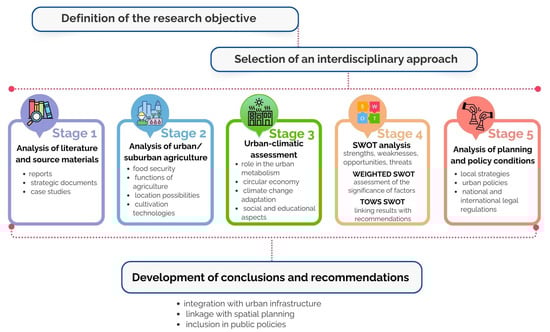 Answers to these questions were sought in five interrelated stages that together formed a coherent whole (Figure 2). The first step was a review of scientific literature as well as strategic documents, supplemented with industry reports and an analysis of urban food and climate plans [69,70,71]. For this purpose, the Scopus and Web of Science databases were searched, along with FAO and UN-Habitat reports, which together allowed the collection of over 200 literature sources. After an initial selection, about 155 were chosen as the basis for further work. At this stage, the aim was to identify global trends in urban food production, applied technologies, examples of food production in underground spaces, as well as cases of successful implementations and data on problems and barriers encountered at various stages of their functioning [74,75].