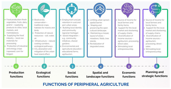 Peri-urban agriculture supports urban agriculture systems and is related to the implementation of agricultural activity conducted in urban outskirts, that is, in suburban or transitional areas between urbanized and rural areas, constituting a buffer zone. In the urban planning context, peri-urban agriculture forms a barrier to uncontrolled urban sprawl and is constantly under urban pressure (e.g., development or infrastructure projects). In Europe, these areas cover approximately 48,000 km2, and their size is comparable to that of urbanized areas [82,83,84,85,86]. Similar to urban agriculture, peri-urban agriculture fulfills several important functions (Figure 4), including production, such as enabling the supply of fresh vegetables and fruits to cities; ecological, performing many tasks such as supporting biodiversity and strengthening the city’s green infrastructure; spatial and landscape, serving as a spatial barrier limiting urban sprawl and preserving the landscape mosaic with field trees; and social, becoming a place where residents can build an identity, socially integrate, and fill the educational gap for children and youth. In terms of the economic function, it provides additional sources of income for local farmers and their families, supporting the local market and shortening supply chains. Peri-urban agriculture influences the maintenance of land reserves that can be developed in the future and forms a buffer between the city and countryside, thus fulfilling planning and strategic functions [86].