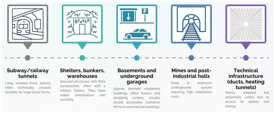 Urban and peri-urban agriculture plays a significant role in maintaining local food systems and supply chains, supporting the local economy, and fulfilling ecological and landscape functions [87,88,89,90]. The pressure of urbanization, visible both at the edges of cities and within their dense fabric, leaves little space for food production. In such conditions, traditional agriculture struggles to find its place in the vision of modern, sustainable urban systems. The answer to these challenges is the development of vertical and underground agricultural systems, which makes it possible to redefine the usability of abandoned and inaccessible areas classified as unsuitable for vegetable cultivation. A special role in this arrangement can be played by underground agriculture. As this form of cultivation is independent of weather phenomena, it allows for the continuous quality control of crops, reduces pressure on the natural environment, and enables continuous harvesting.