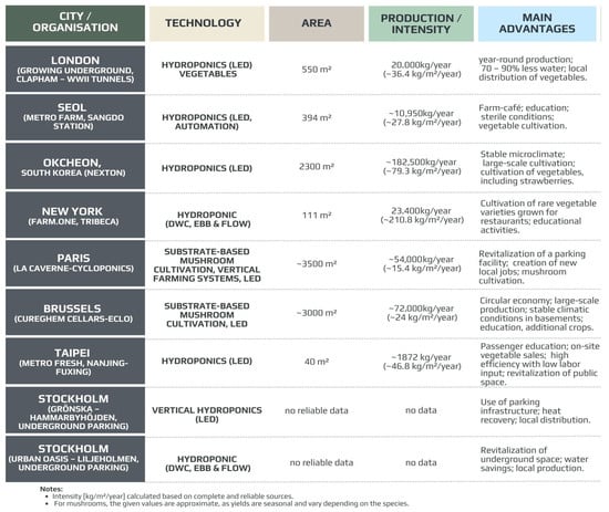 Examples of underground urban farms worldwide with their location, technology, area, production intensity, and main advantages [93,94,95,96,97,98,99,100,101,102].
