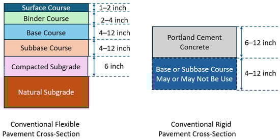 Illustration of the typical structural composition of flexible and rigid pavements, adapted from Huang (2004) [3].