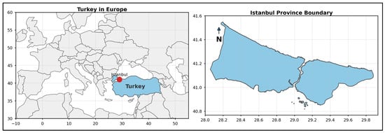 The study area is Istanbul Province, a city characterized by extremely high levels of repetitive loads, where according to 2024 data [27], 41% of drivers experience traffic congestion, and which has a Mediterranean climate according to the Köppen climate classification [28,29], specifically Csa, meaning mild winters and very hot, dry summers. According to 2024 data [30], Istanbul is a metropolitan area with a population of 15.7 million. Istanbul, with its bridges, tunnels, and extensive highway network, connects Europe and Asia and is Turkey’s most important economic and logistics hub. The rugged topography surrounding the city, varying ground conditions, and heavy truck traffic place significant stress on road surfaces. With these characteristics, Istanbul offers an extremely suitable and highly representative study area for evaluating pavement performance under heavy traffic and challenging climatic conditions. A location map of the study area is provided in Figure 2.