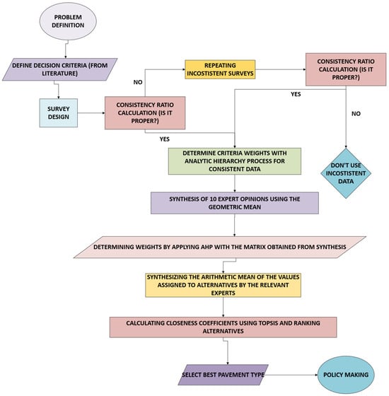 A hybrid method was applied within the scope of this study. The AHP method was used to determine the criteria weights, while the TOPSIS method was used to choose between the two pavement types. Similar AHP–TOPSIS applications in pavement engineering have also been written in recent studies, particularly for preventive maintenance of trunk highways [31] and for evaluating thin asphalt overlays with different material properties [32].