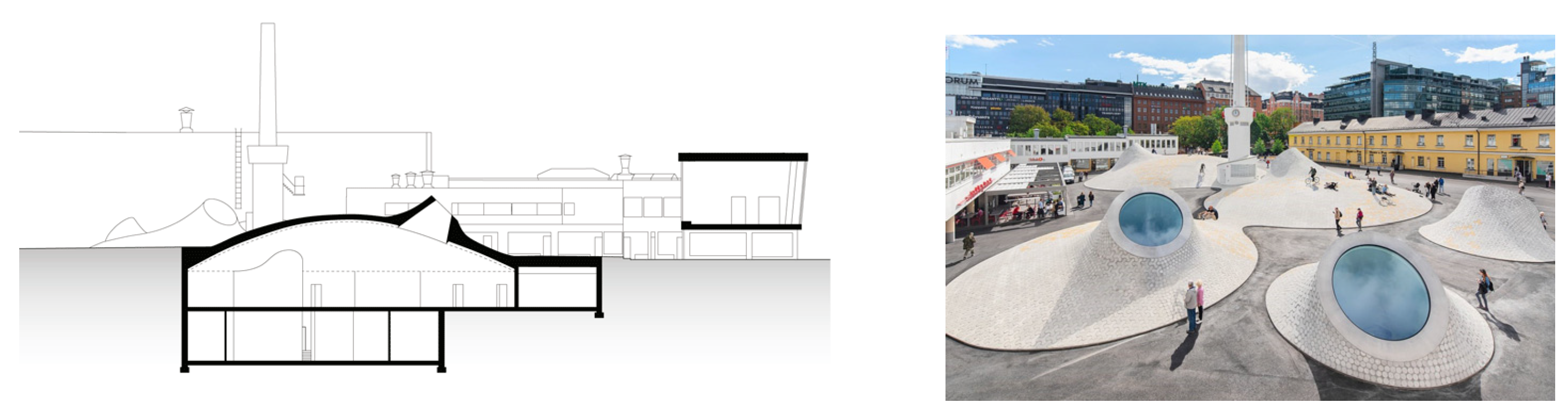 ![]() | Natural Light Dome | Domed openings or fiber tubes that transmit light through the surface | Light tubes, glass floor panels | Allows sunlight to reach underground, reducing energy consumption |