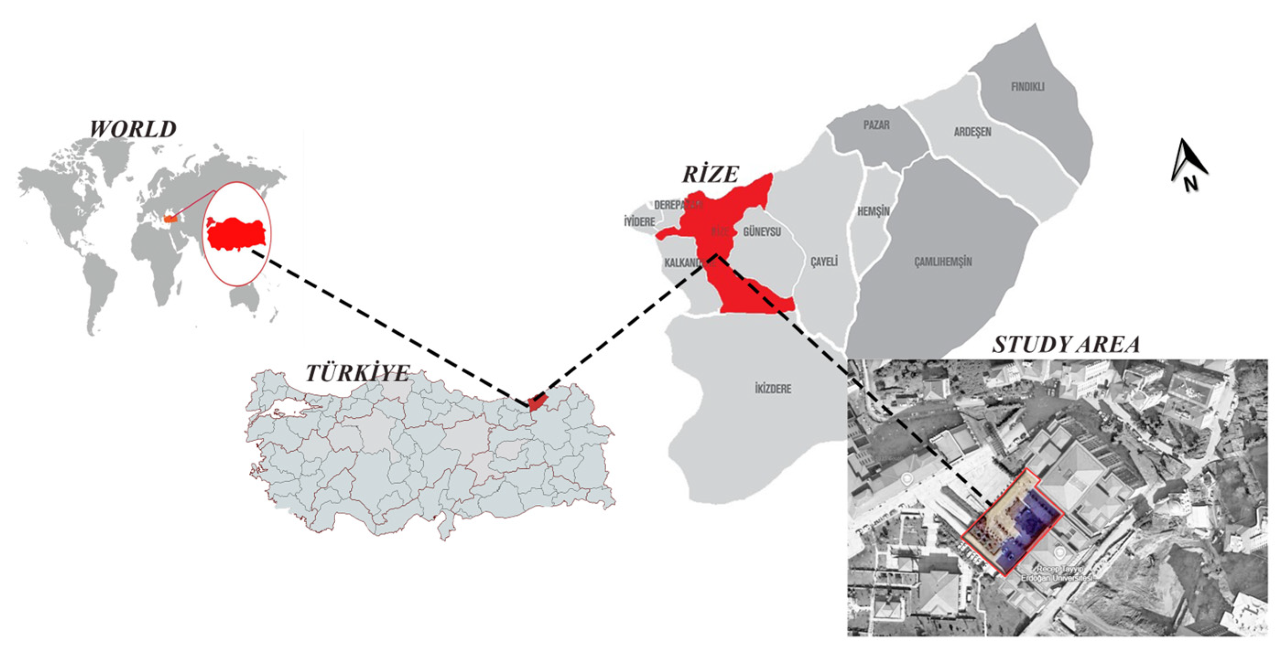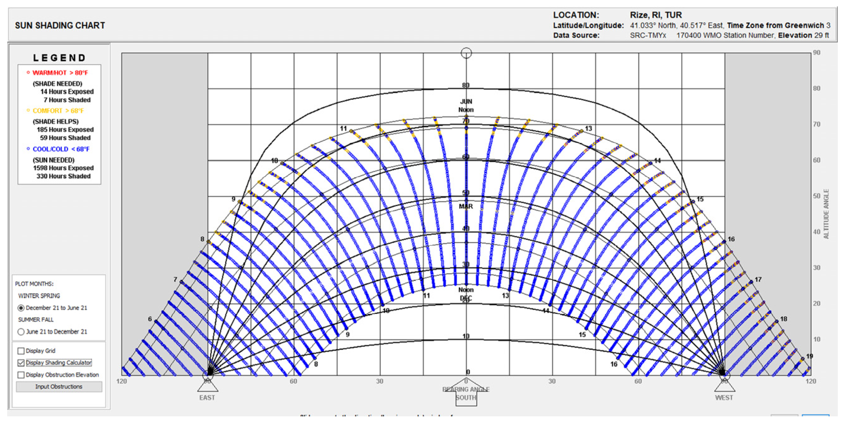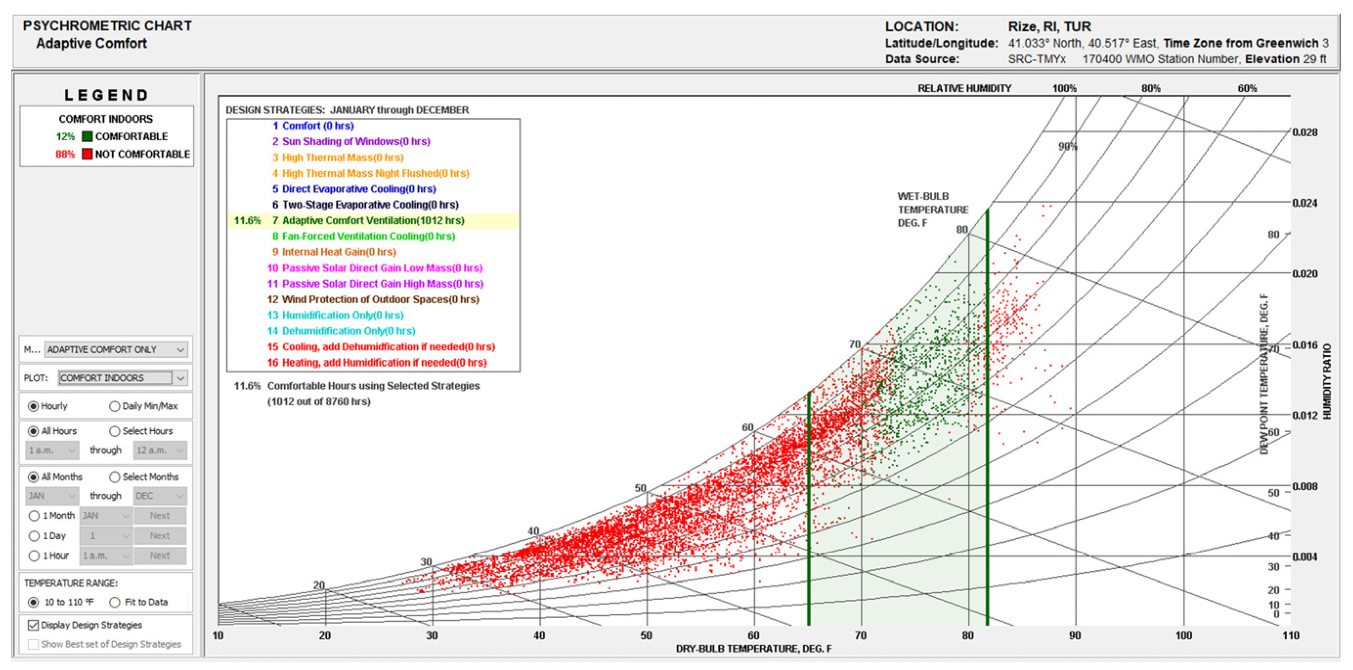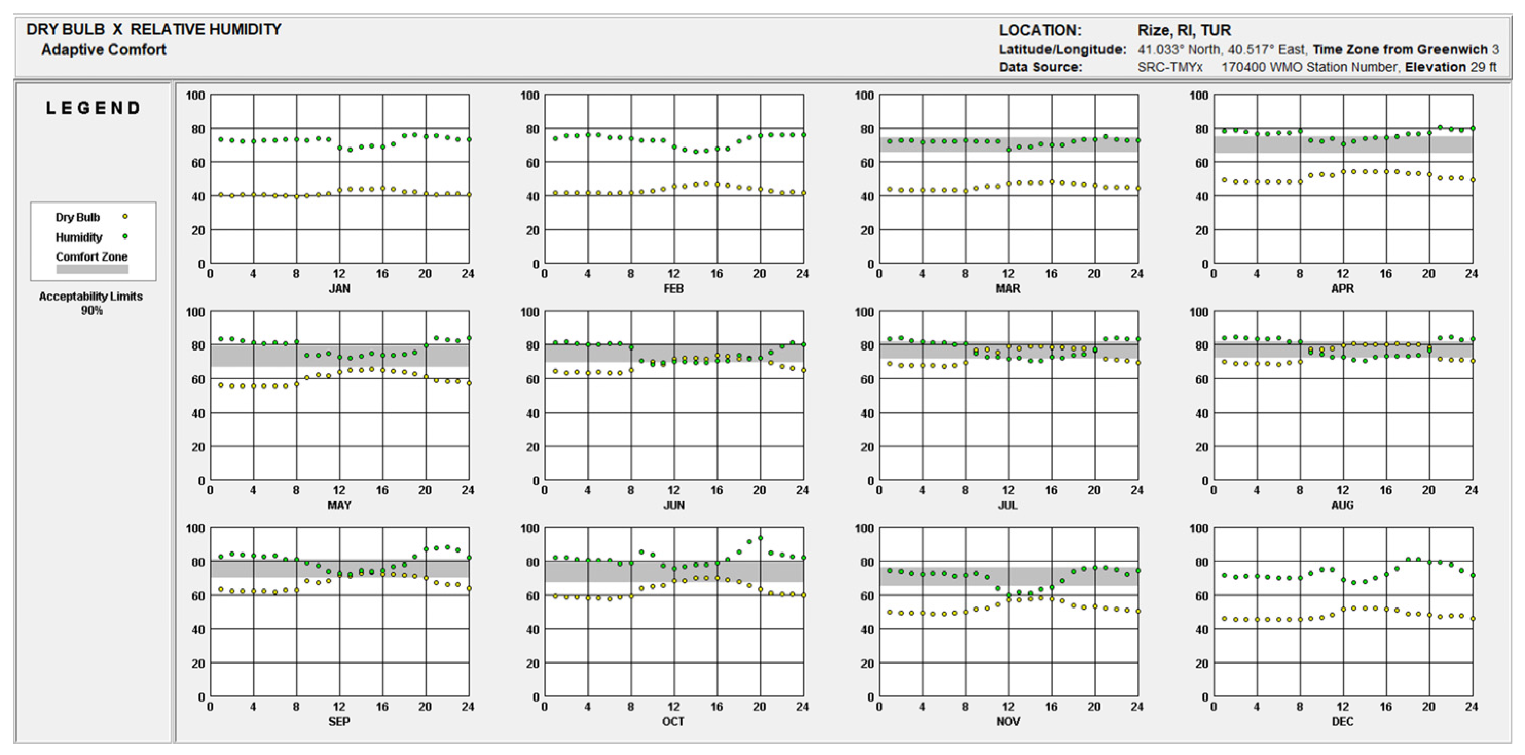 - Mean Temperature Difference (ΔT): In Rize winter season, the indoor average was taken as 20 °C and the outdoor average was taken as 8 °C, and the difference was determined as 12 °C [98].