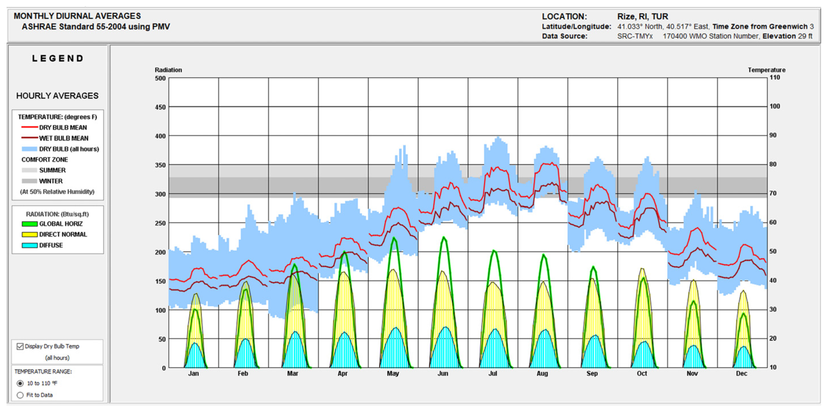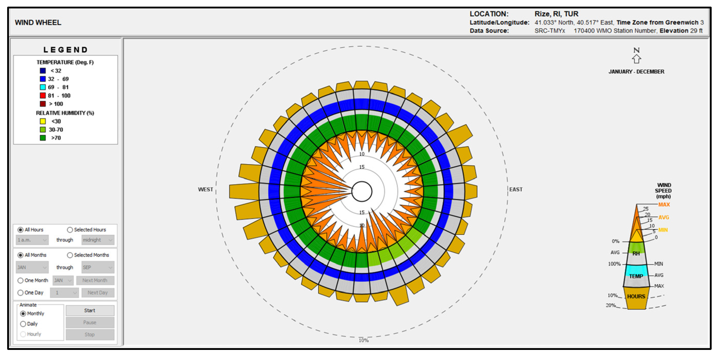 - Milne, M.; Liggett, R.; Benson, A.; Bhattacharya, Y. Climate Consultant 4.0 develops design guidelines for each unique climate. In Proceedings of the American Solar Energy Society Meeting, Buffalo, NY, USA, 11–16 May 2009. [Google Scholar]