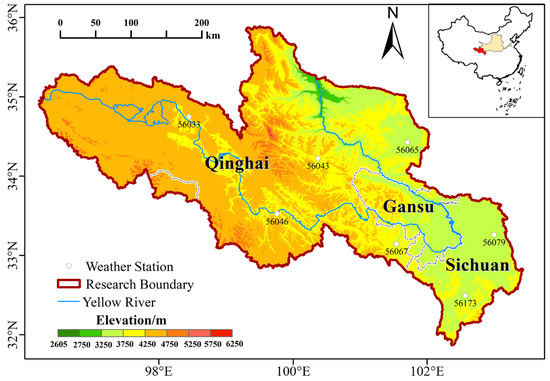 The source region of the Yellow River is located in the northeastern part of the Qinghai–Tibet Plateau, with geographical coordinates ranging from 95°50′ to 102°30′ E and 33°12′ to 36°48′ N. The headwaters of the Yellow River originate at the administrative boundary between Maduo County and Qumalai County in Qinghai Province, with its hydrological boundary extending to the Tangnaihai Hydrological Station in Xinghai County, which serves as the regional outlet [26]. The basin spans approximately 120,000 km2 across six prefectures in three provincial-level administrative regions (Qinghai, Gansu, and Sichuan). The region features complex and diverse topography, with elevations ranging from 2605 to 6200 m, and the terrain generally decreases in elevation [1].