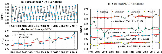 Temporal trends of vegetation in the source region of the Yellow River from 1998 to 2018. (a) Intra-annual NDVI variations across the study period. (b) Trend of the annual average NDVI. (c) Seasonal NDVI variations (Spring: March to May; Summer: June to August; Autumn: September to November; Winter: December to February).